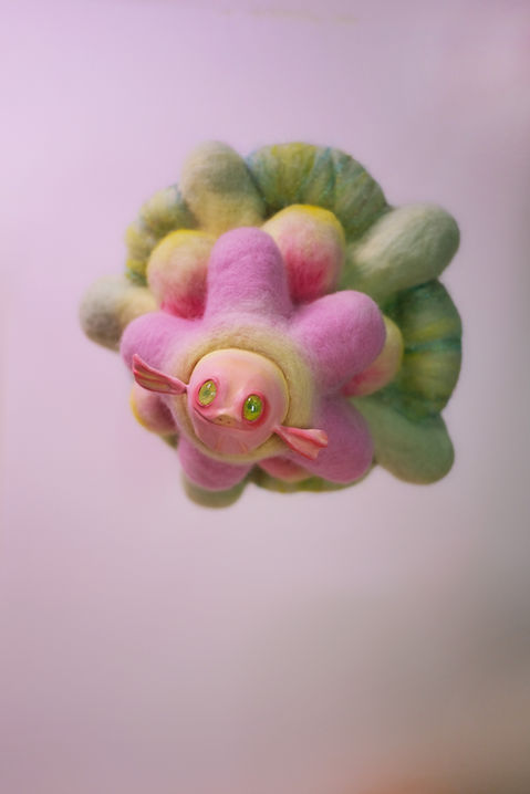 The felted body of the fish brings a soft and opaque blurriness that resembles the fogged line between our memory and reality. The body's structure mimics a Christmas tree, as nostalgia for me has long been the Christmases Mom and I had in Buffalo. With pastel tones, I illustrate what Christmas was like for me as a child - magical, fantastical - and with each tier's rounded edges and star-like shape, I reinforce a sense of naiveness and child-like innocence. The resin eyes encase star sequins, symbolic of our “starry-eyed” attitude toward the past, as we seemingly glorify and yearn for the moments we have lost.